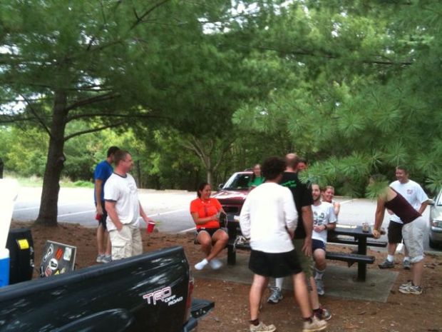 We gave the hare “Captain Spewart” a normal 15 minute head start. HEAD!! Who said head. Yadayadayada. The thirsty pack left out and immediately lost trail. WTF. OK we found it. We hashed trough shiggy and and slid down 10 ft embankments into a river where we found our first beer near. We all drink a cold refreshing beverage. Thank goodness I packed in a few extra beers.